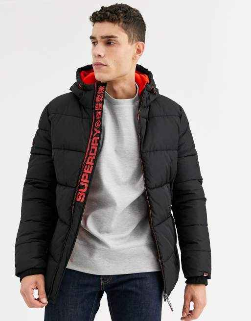 Superdry - Sort Dynejakke med hætte og orange lynlåsbånd