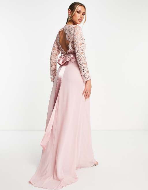 TFNC - Brudepiger - Marineblå langærmet maxikjole i bølget kant og lange ærmer i gråbrun