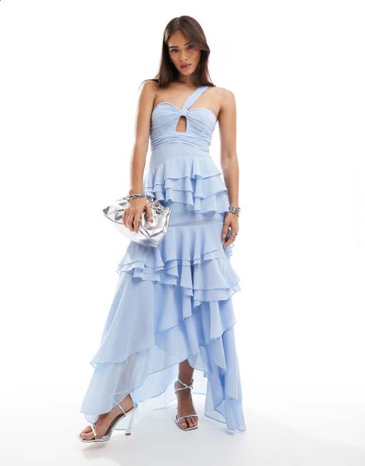 TFNC - Lyseblå oneshoulder-maxikjole med flæser