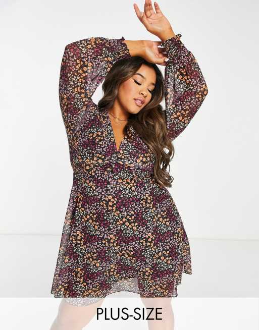 The Frolic Plus - Flagrende tea-minikjole med mesh-ærmer og snoet front i småblomstret print