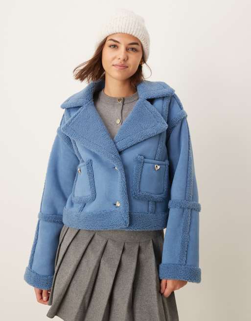 The Frolic - Blå jakke med hjerteformede knapper i guldfarve i imiteret shearling - Kun hos ASOS