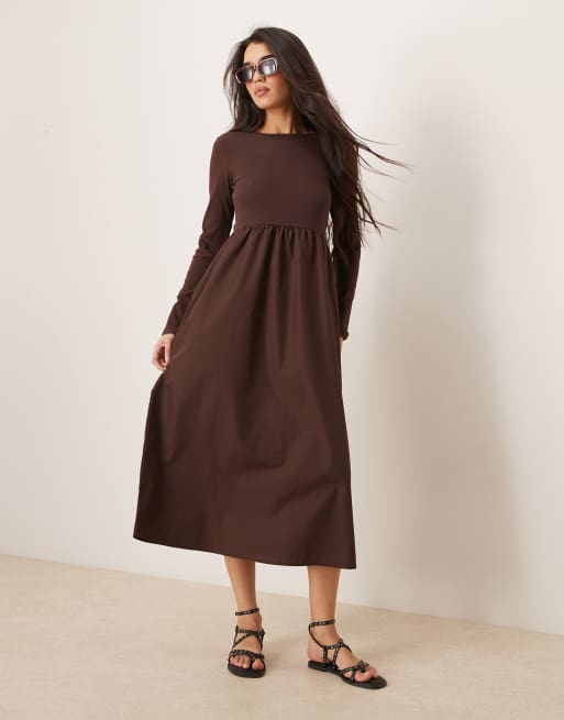 Threadbare - Brun langærmet midikjole med poplin-skørt