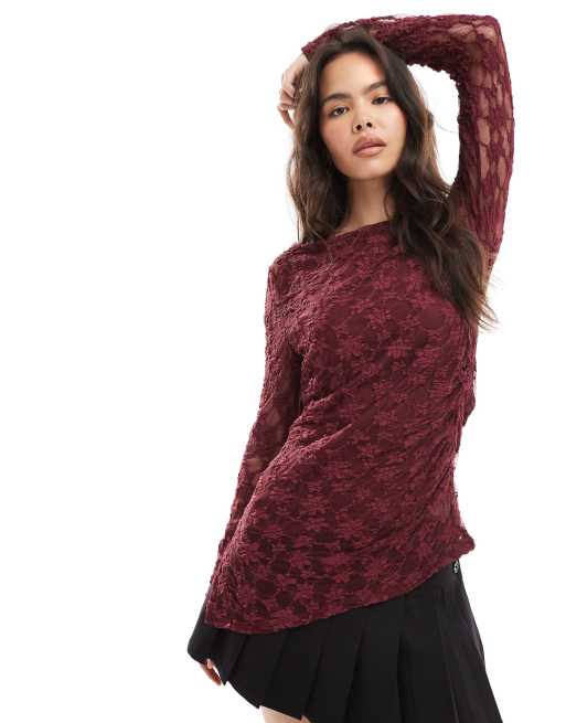 Threadbare - Figenfarvet top med lange ærmer og asymmetrisk kant forneden i blondestof