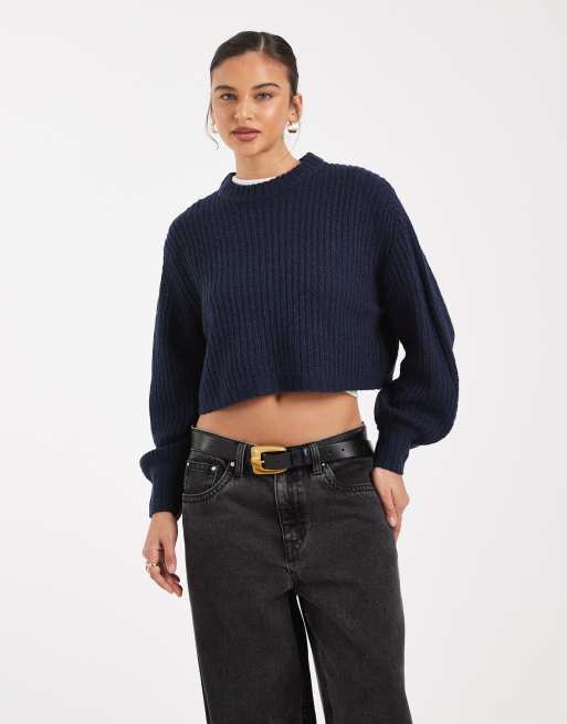 Threadbare - Marineblå ribstrikket cropped trøje med rund hals