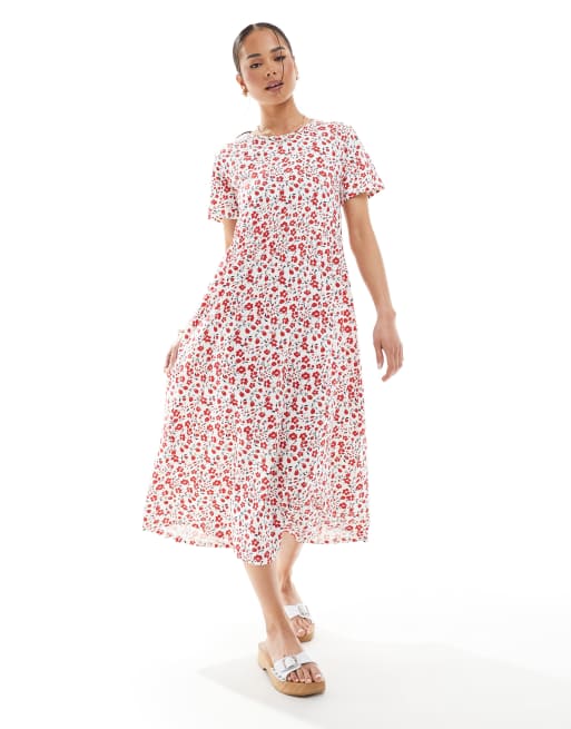 Threadbare - Rød midikjole med korte ærmer, lommer og blomstermønster i jersey