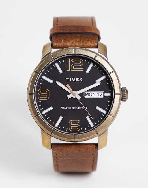 Timex - Armbåndsur med sort urskive og brun rem i ægte læder