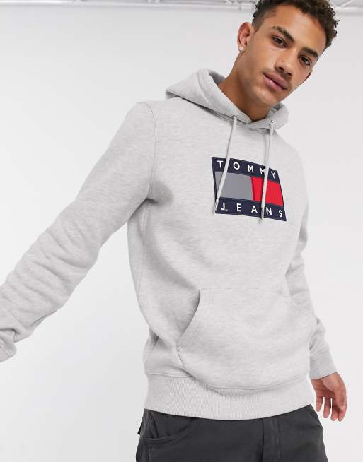 Tommy Jeans - Gråmeleret hættetrøje med metalfarvet flaglogo på bryst