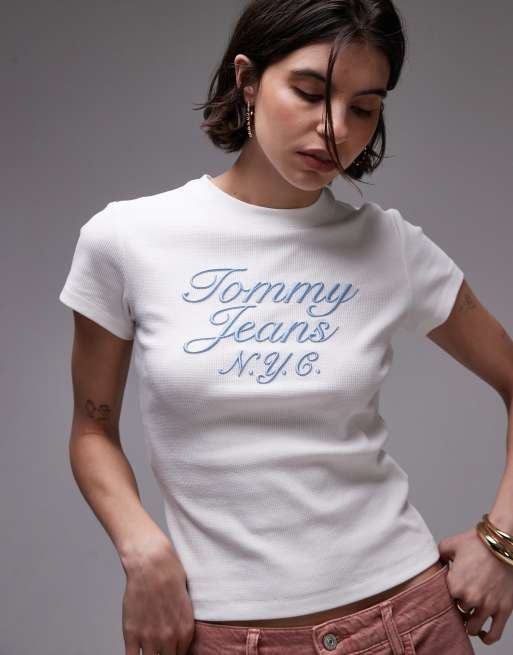 Tommy Jeans - Hvid T-shirt med babyblåt broderet logo med skråskrift