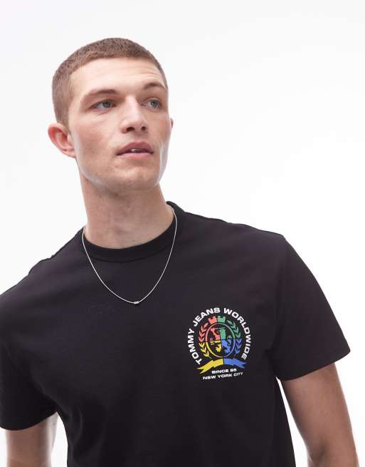 Tommy Jeans - Sort T-shirt med farverig grafik med våbenmærke på ryggen