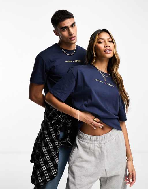 Tommy Jeans - Unisex - Marineblå T-shirt med klassisk lineært logo i guldfarve