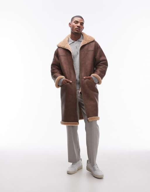 Topman - Brun longline jakke i imiteret lammeskind