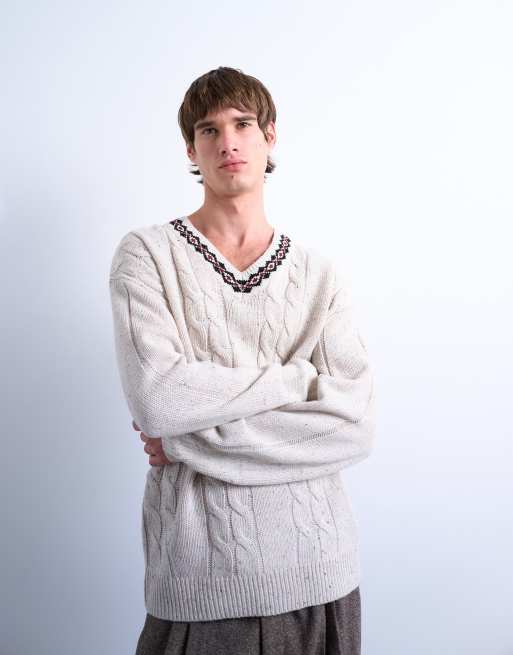 Topman - Ecrufarvet afslappet kabelstrikket trøje med V-hals og Fair Isle-detalje