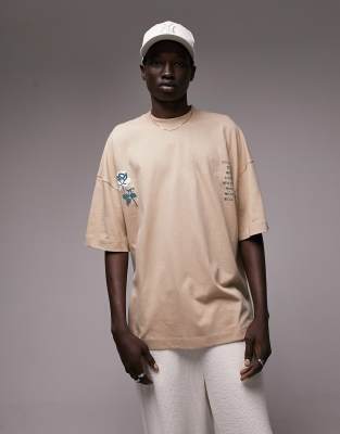 Topman - Ekstremt oversized beige T-shirt med blomstret byprint på front og ryg