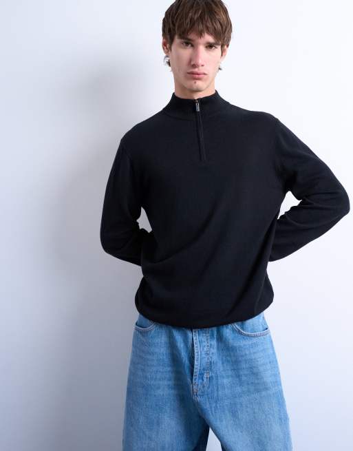 Topman - Essentials - Sort strikket trøje med ståkrave og 1/4 lynlås