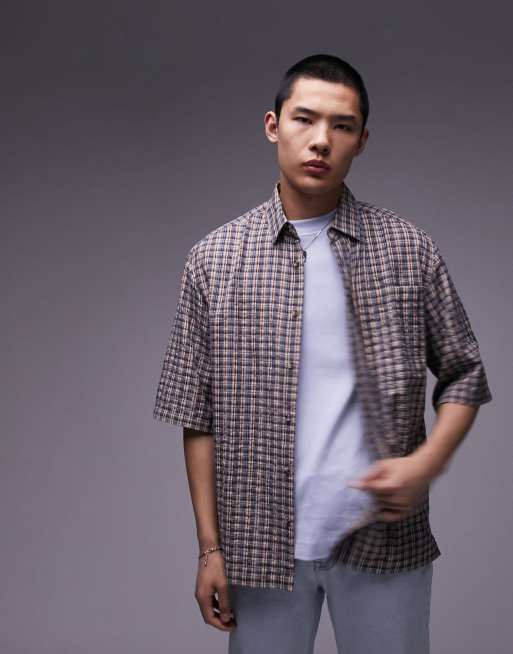 Topman - Kortærmet skjorte med marineblåt gittertern
