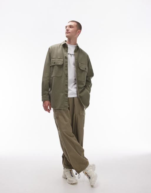 Topman - Oversized skjorte med lange ærmer og dobbeltlomme i vasket grøn twill