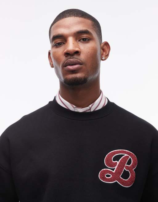 Topman - Sort oversized kraftig sweatshirt med chenille-broderi med bogstav