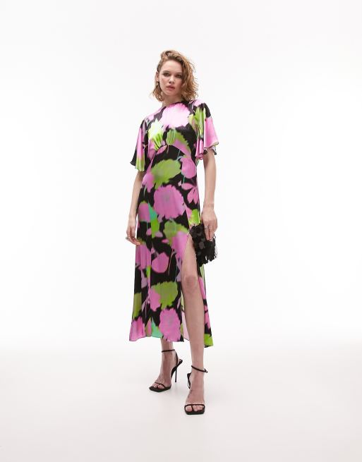 Topshop - Austin - Multifarvet midikjole til særlige lejligheder med engleærmer og stort blomstermønster
