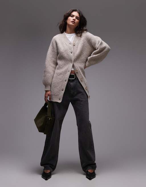Topshop - Beige cardigan-kjole med høj V-hals i vamset strik
