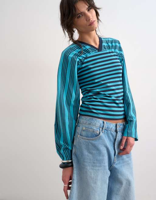 Topshop - Blå top med lange ærmer, samling på livstykket og striber