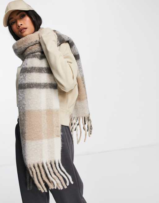 Topshop - Børstet oversized tørklæde i neutralfarvede tern - BEIGE