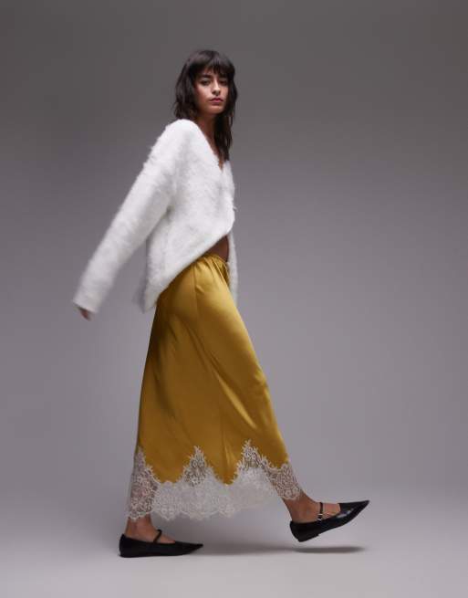 Topshop - Chartreusegrøn maxikjole i satin med hvide blondedetaljer