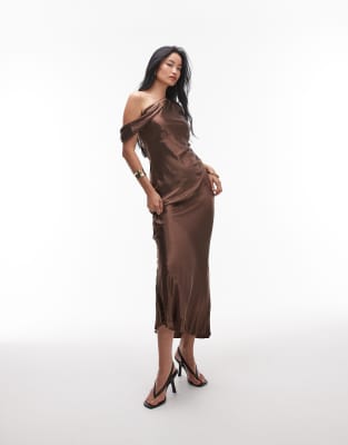 Topshop - Chokoladebrun midikjole til særlige lejligheder med draperet hals og offshoulder-snit