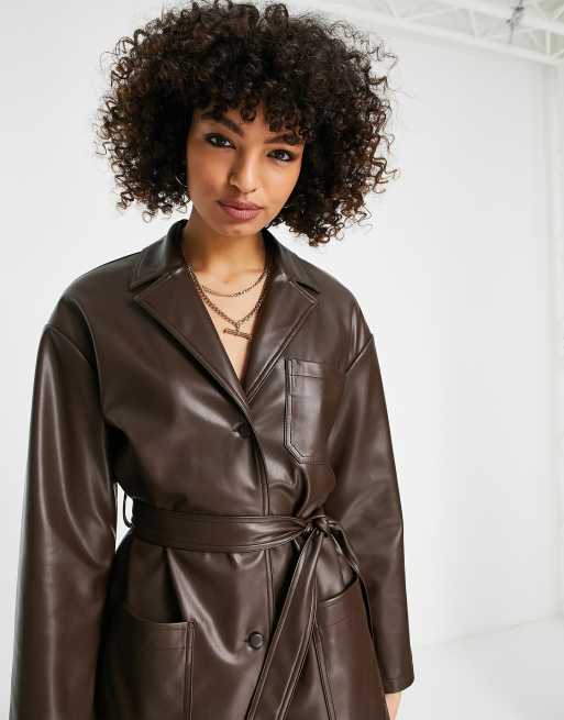 Topshop - Chokoladefarvet skjortejakke med reverskrave og bælte i imiteret læder