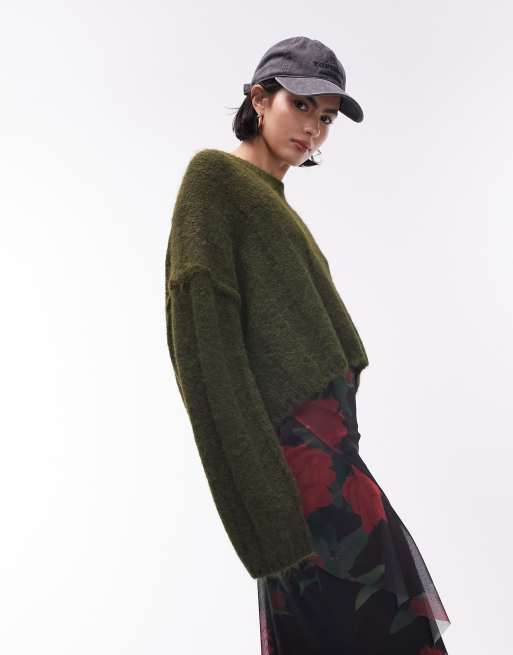 Topshop - Cropped kakifarvet trøje i plysset ribstrik