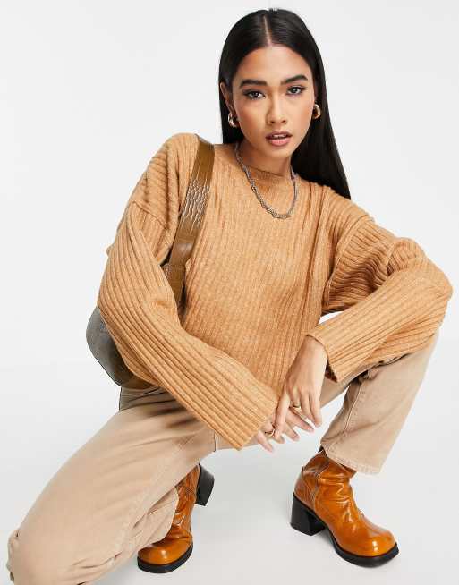 Topshop - Cropped, ribstrikket trøje med rund hals i kamelbrun polyesterblanding