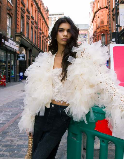 Topshop - Elfenbensfarvet strikket cardigan med ekstrem tekstur og organza