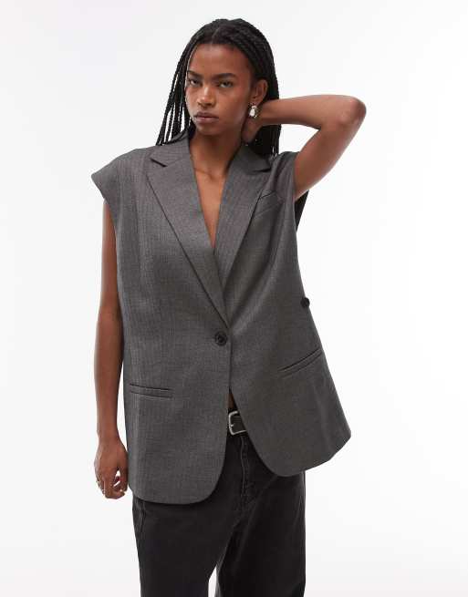Topshop - Grå blazer uden ærmer med sildebensmønster