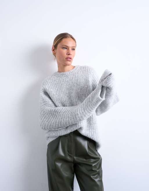 Topshop - Grå ribstrikket oversized trøje med ballonærmer