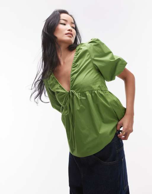 Topshop - Grøn top med pufærmer i poplin
