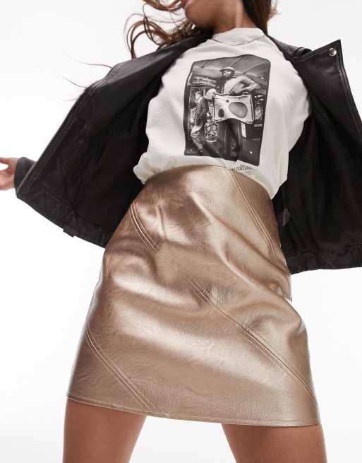 Topshop - Guldfarvet mininederdel med diagonale sømme i læderlook