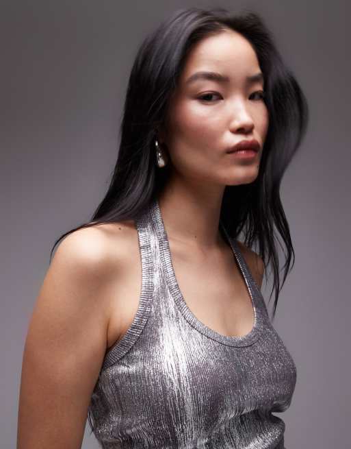 Topshop - Gunmetalfarvet overdel i folie med halterneck