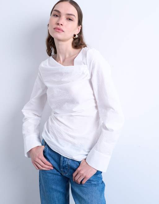 Topshop - Hvid og langærmet top med draperinger i halsen