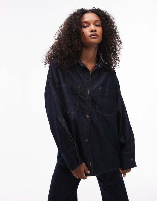 Topshop - Indigoblå oversized denimskjorte med lommedetaljer
