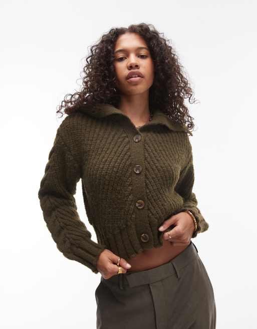 Topshop - Kakigrøn cardigan i chunky kabelstrik med krave