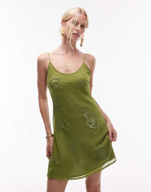Topshop - Kakigrøn minikjole med dyb rund hals og udsmykning med muslingeskaller