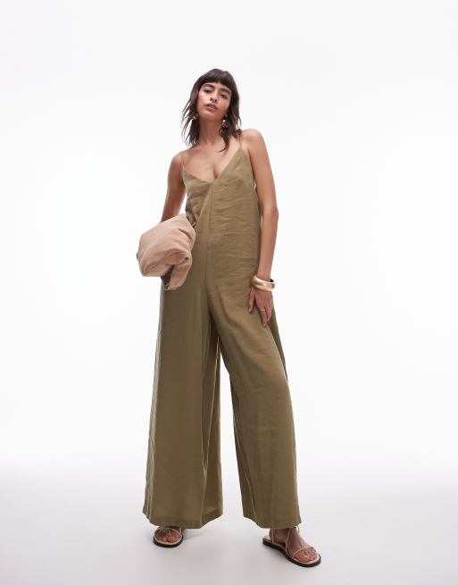 Topshop - Kakigrønt jumpsuit med cami-stropper, vide ben og bindebånd bagpå