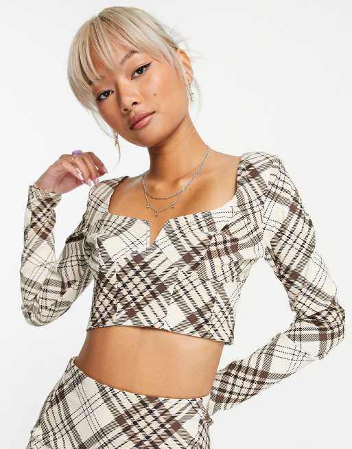 Topshop - Kamelbrun top med lange ærmer og tern i bengalin - Del af sæt