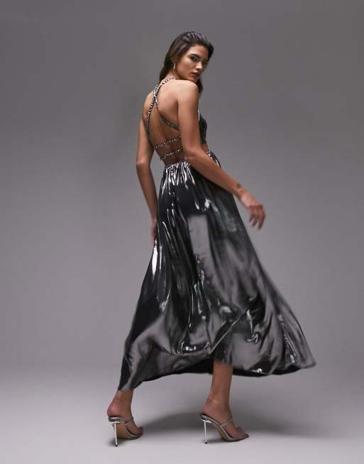 Topshop - Lame - Metalfarvet maxikjole med nøglehulsudskæring og elastikdetalje i sølv