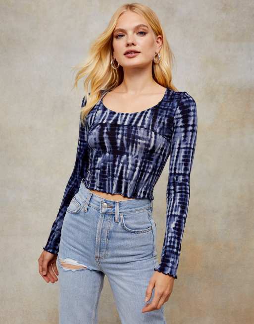 Topshop - Langærmet croptop i indigoblå batik med bindebånd
