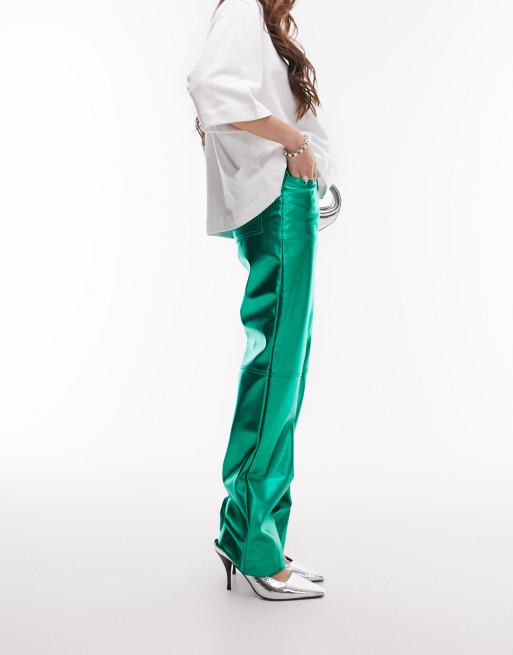 Topshop - Lavtaljede bukser i metallisk grøn imiteret læder med lige ben og flap i taljen