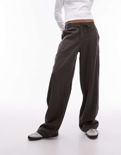 Topshop - Lavtaljede bukser med lige ben og løbesnor i taljen i koksgråt hør