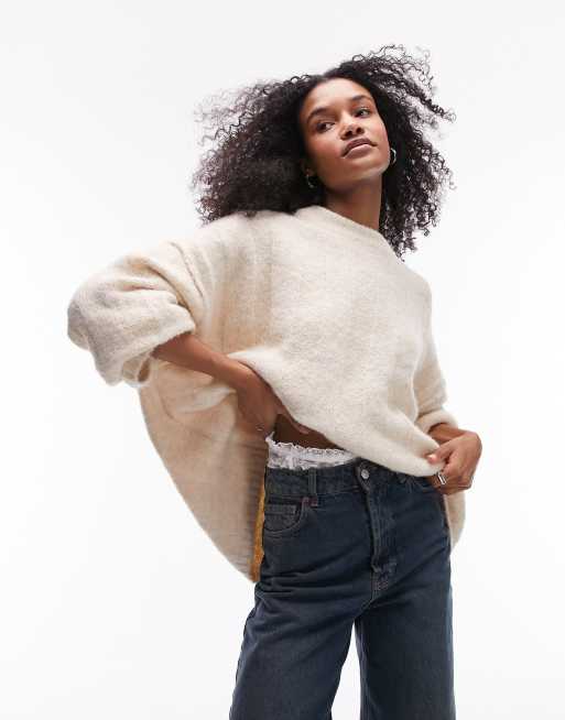 Topshop - Løstsiddende, oversized trøje med synlige sømme i vamset, bred ribstrik i elfenbenshvid