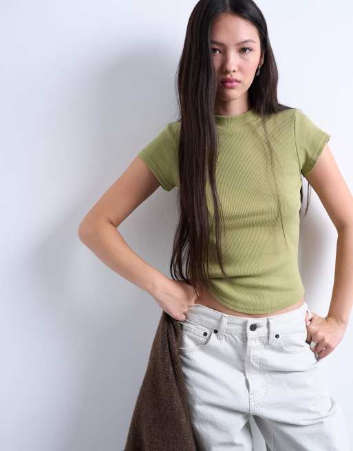 Topshop - Lys tætsiddende khakifarvet T-shirt med ribkant og kurvet kant