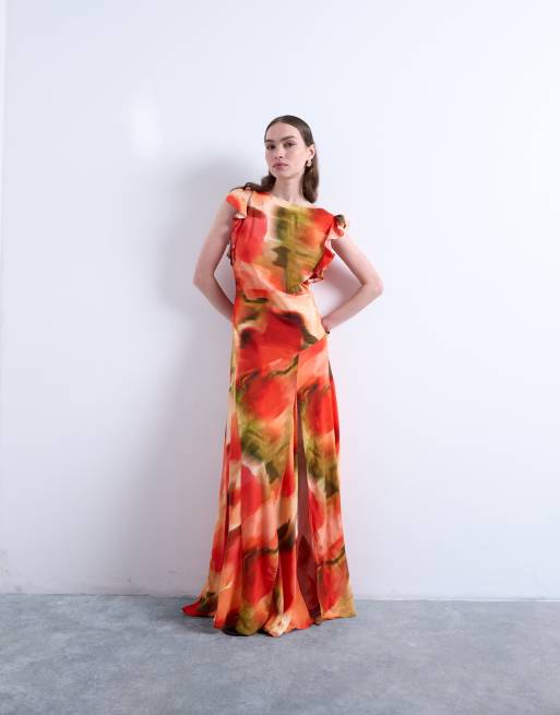 Topshop - Maxikjole med abstrakt blomstermønster og flagrende ærmer samt vandfaldsudskæring bagpå