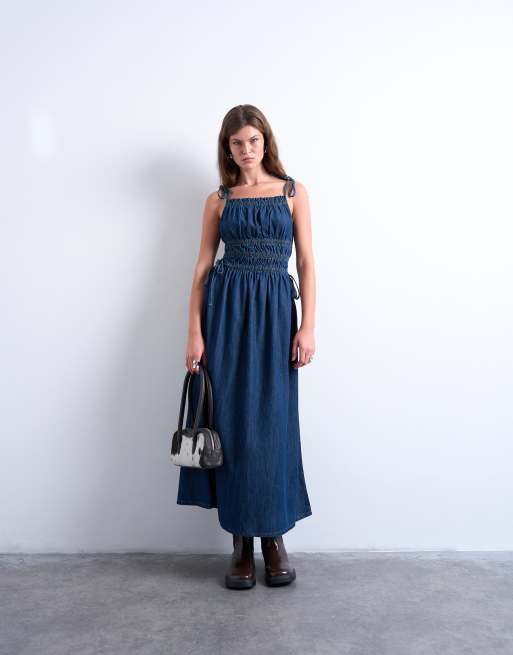 Topshop - Mellemblå denim-maxikjole med rynket stropper
